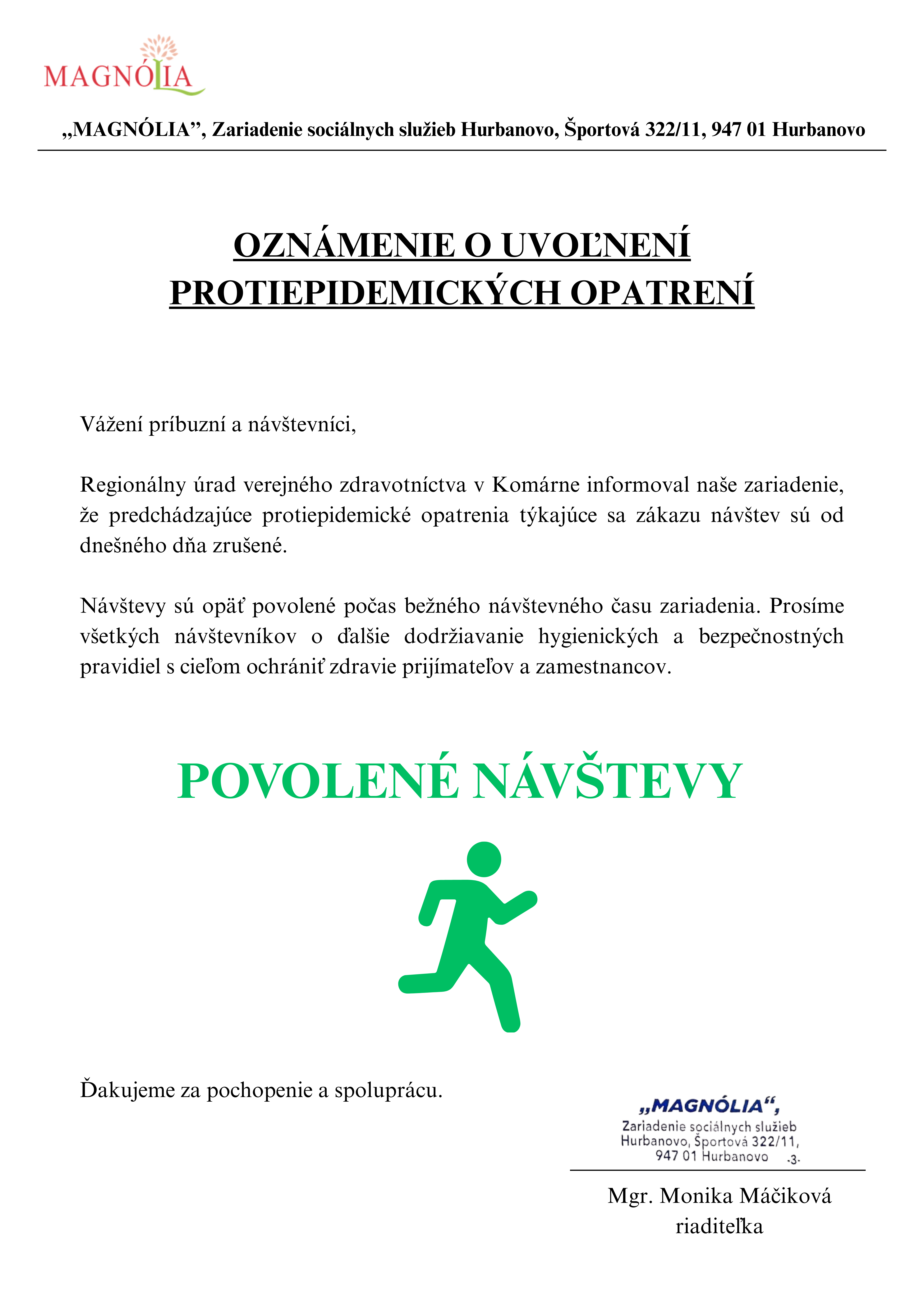 Regionálny úrad verejného zdravotníctva v Komárne informoval naše zariadenie, že predchádzajúce protiepidemické opatrenia týkajúce sa zákazu návštev sú od dnešného dňa zrušené.