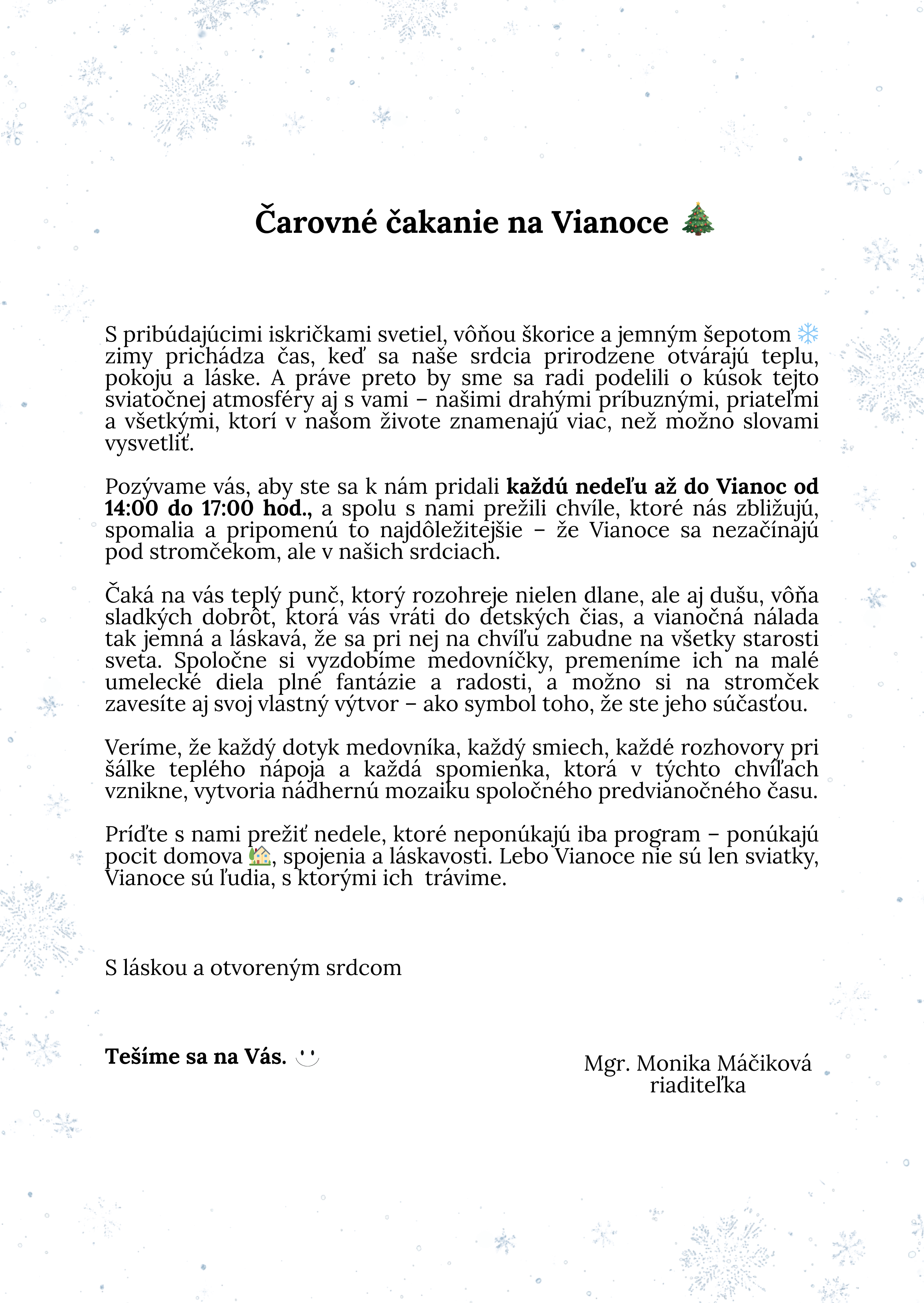 Vážení prijímatelia sociálnej služby a návštevníci,