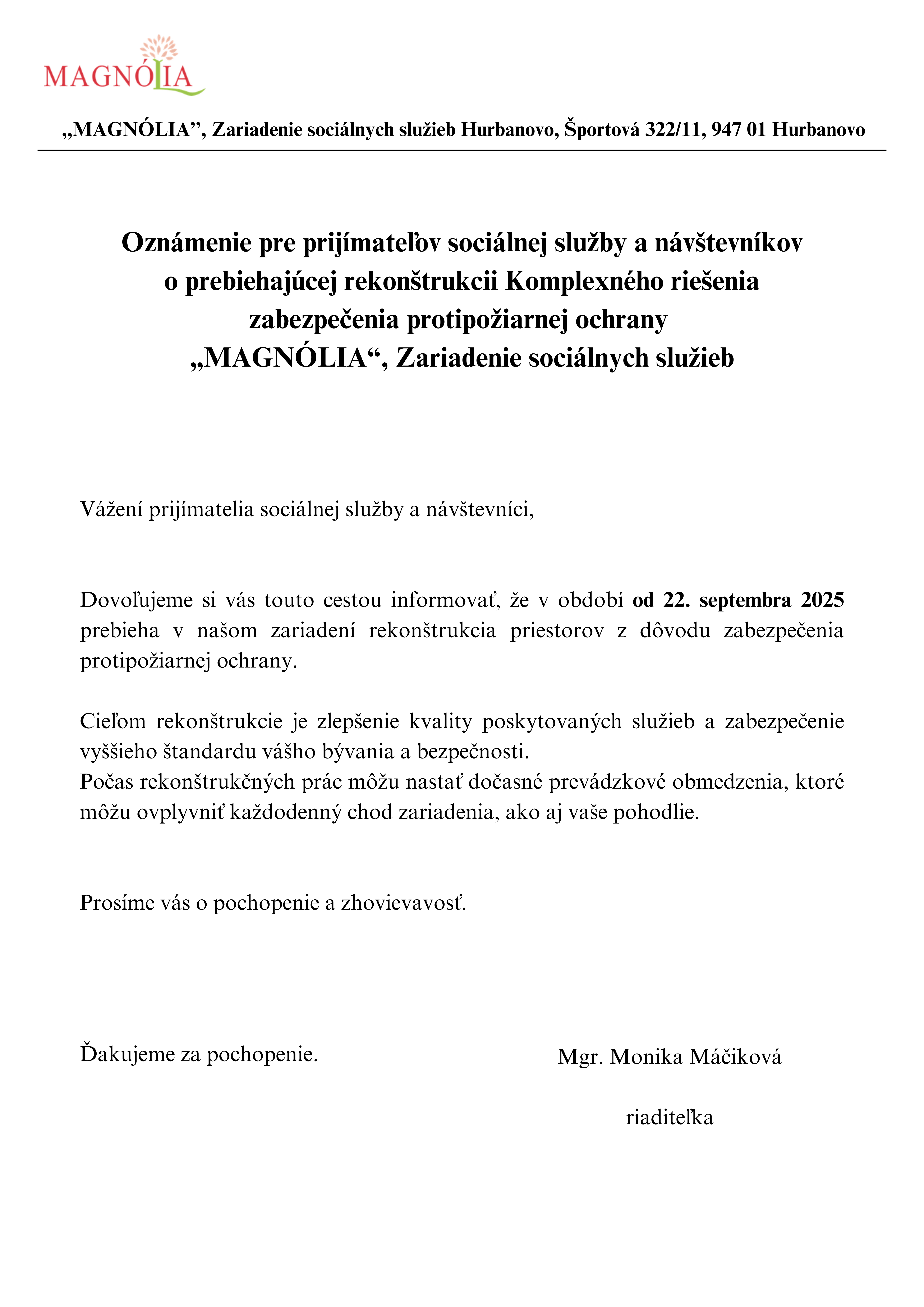 Dovoľujeme si vás touto cestou informovať, že v období od 22. septembra 2025 prebieha v našom zariadení rekonštrukcia priestorov z dôvodu zabezpečenia protipožiarnej ochrany.